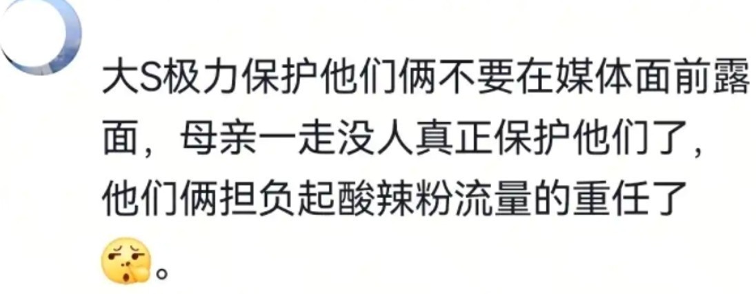 对于大S的当初的想法,网友给予了肯定,并认为如今曝光小玥儿的照片,无疑是违背了大S的意愿,甚至心疼小玥儿,母亲走了以后就失去了保护,并质疑如今还要背负起麻六记的流量重任,简直太可怜了。